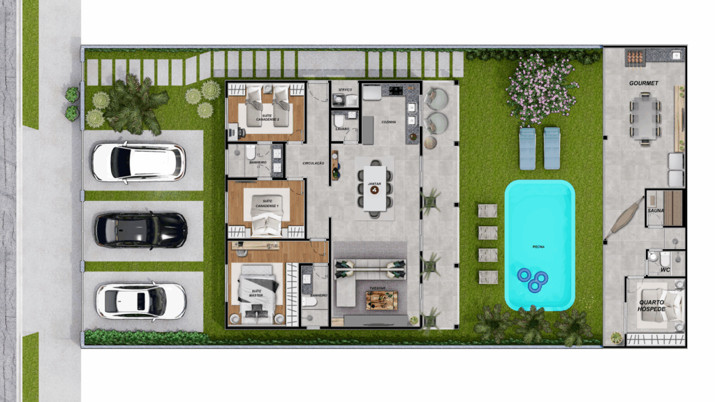 Decoração ilustrativa para a casa com 3 quartos